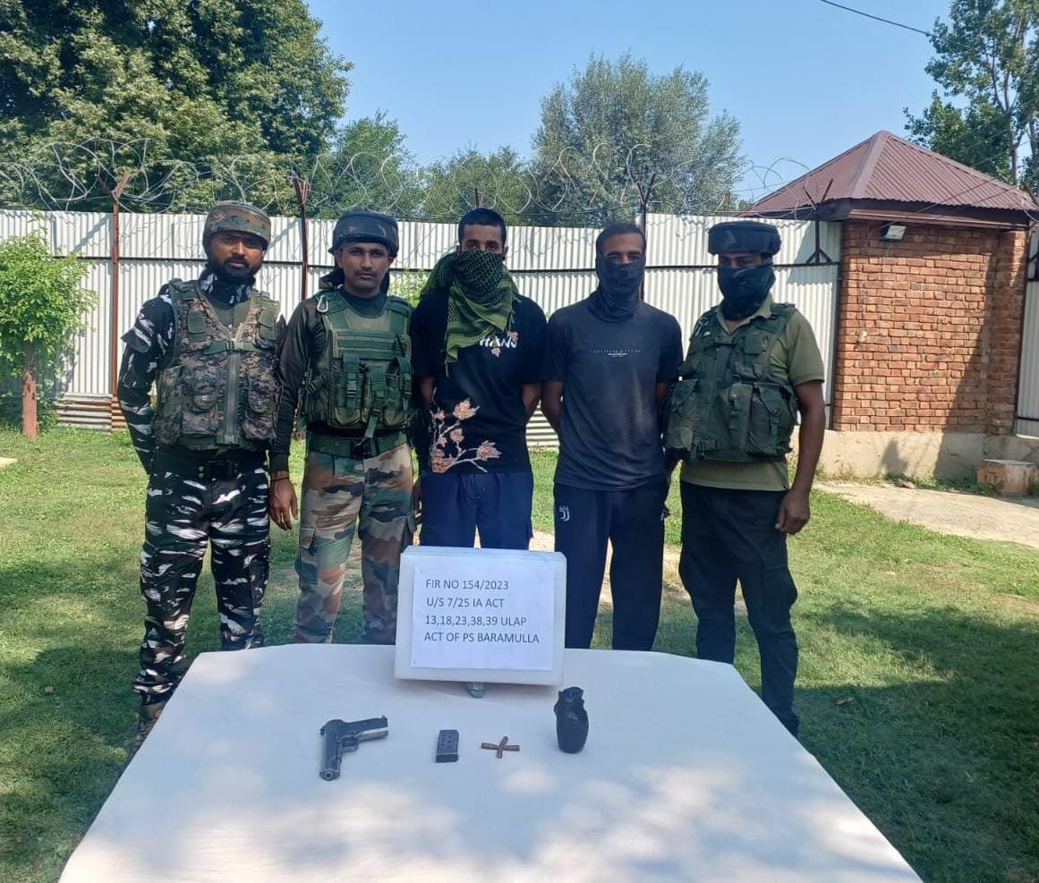 Srinagar, Aug 02 : Jammu and Kashmir Police on Wednesday said to have arrested two hybrid terrorists associated with LeT alongwith arms ammunition at Azadgunj area in Baramulla.
