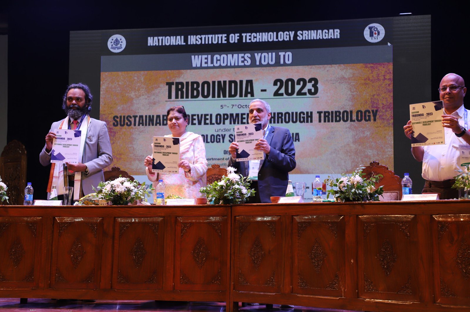 President of the Tribology Society of India (TSI), Prof. Satish Vasu Kailash, Director NIT Srinagar, Prof. Sudhakar Yedla, Patron of TriboIndia 2023, Conference chairman, Prof. M.F. Wani, Prof. Adnan Qayoum (HoD MED), Prof. G A Harmain (HAG), Prof. Koshi Adachi, Tohoku University, Japan, Prof. Irina Goryacheva, RAS, Russia and other dignitaries were present in the podium.