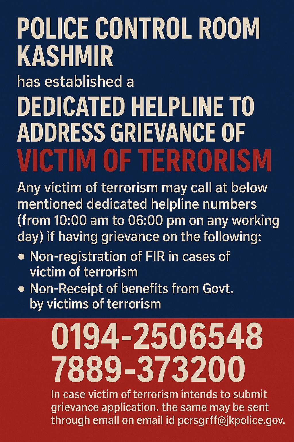 Citizens can reach out to the helpline by calling 0194-2506548 or 7889-373200 between 10:00 AM and 6:00 PM on working days. Additionally, written grievances can be submitted through email at pcrsgrff@jkpolice.gov.in.