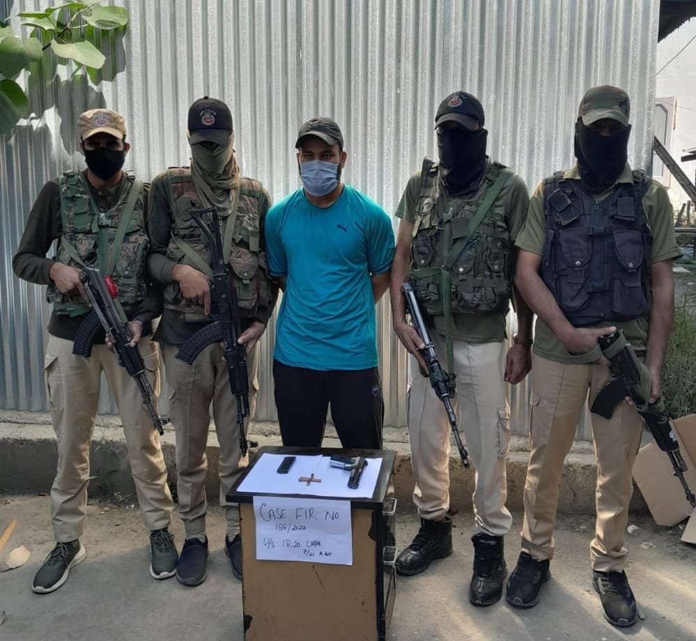 “One Categorised terrorist of AGH terror outfit namely Junaid Ahmad Parray of Nawakadal arrested by a joint team of Srinagar Police and 24 RR from Palpora, Srinagar. One pistol, magazine and live rounds also recovered. Case under sections of UAPA registered in Safakadal PS,” police tweeted—(KNO)