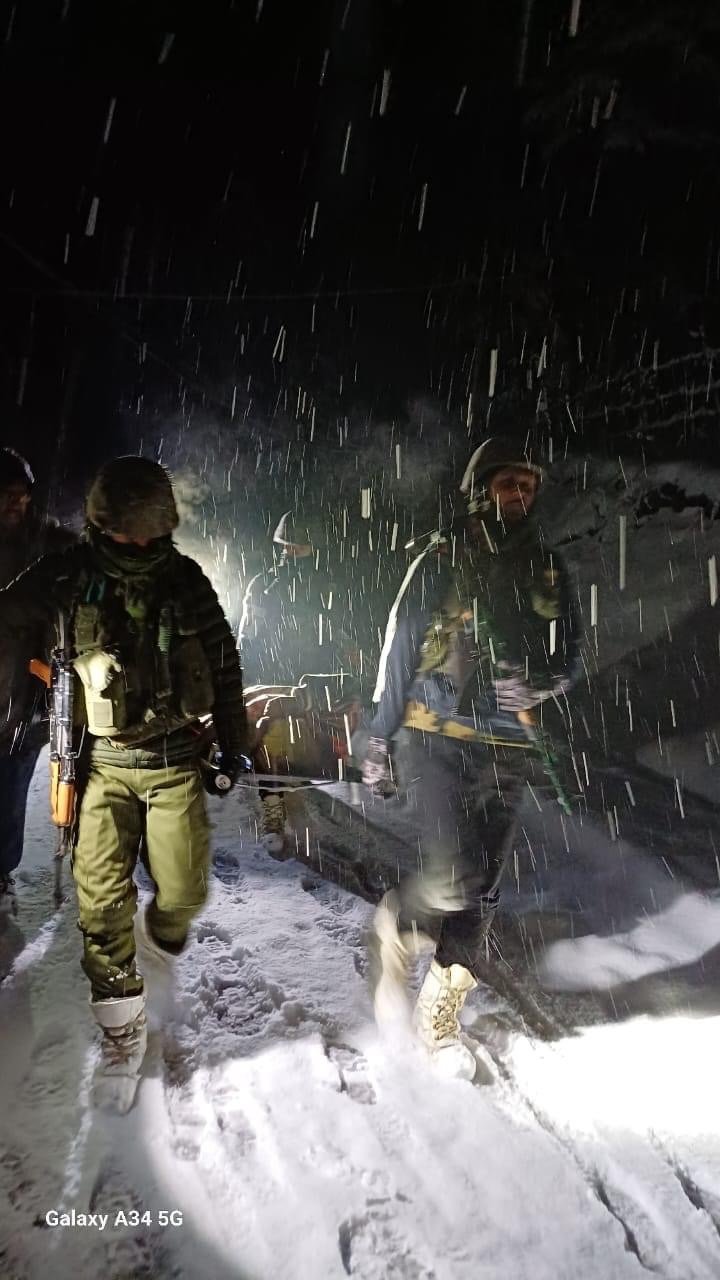 “Due to heavy snowfall from last two days, the road was completely blocked and vehicle’s movements was very difficult. Realising the exigency, rescue team and medics from Army Camp Kakrosa immediately responded to distress call, risking their own safety, while hiking for 7-8 km in 2 to 3 feet of snow in the middle of the night. In spite of heavy snow on the road, the rescue team reached the location in time and the patient was carefully and safely evacuated to PHC Vilgam.
