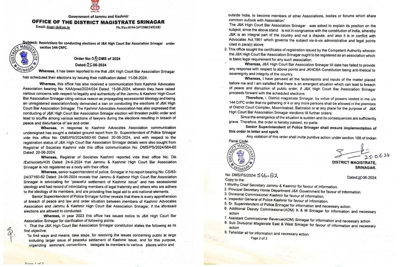 “Whereas, I have perused all the facts/reports and inputs of the matter placed before me and I am satisfied that there is an emergent situation which can lead to breach of peace and disruption of public order, if JK HCBA, Srinagar proceeds forward with the scheduled elections.