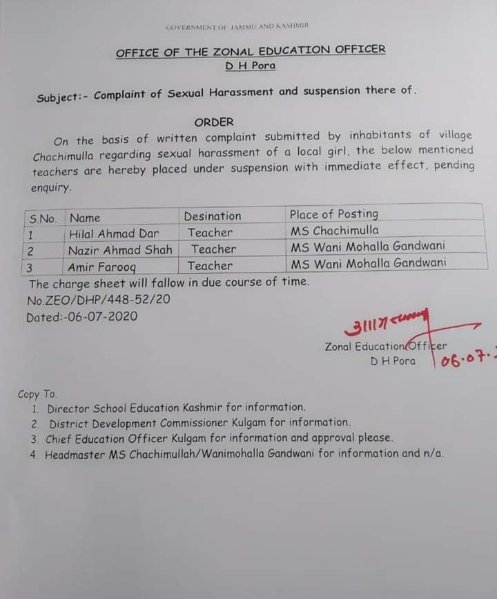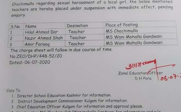 In an order copy which lies with KINS news agency reads, on the basis of written complaint submitted by inhabitants of village Chachmulla regarding sexual harassment of a local girl, the three teachers (name withheld) are being placed under suspension with immediate effect pending inquiry.