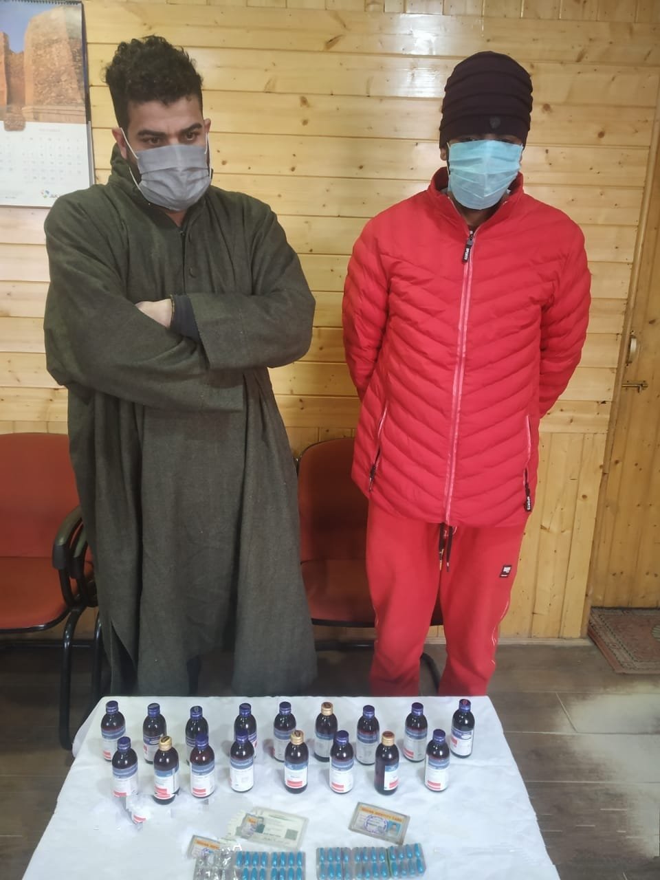 Officers at a checkpoint established at Nambal Crossing intercepted a vehicle THAR bearing registration number JK01X-4920 with two persons on board. They have been identified as Waseem Ahmad Trag son of Ali Mohammad Trag resident of Tral and Mohammad Lateef Sheikh son of Abdul Rehman Sheikh resident of Batagund Tral. During checking, officers were able to recover 17 bottles of Codeine Phosphate and 39 Spasmo-Proxyvon tablets from their possession. They have been arrested and shifted to Police Station Awantipora where they remain in custody. Vehicle used in the commission of crime has also been seized.