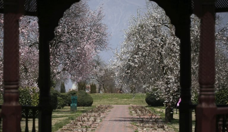 The aromatic garden, located in the foothills of historic Koh-e-Maraan in Srinagar city, is famous for almond bloom and is also known as “Badam Waer”.