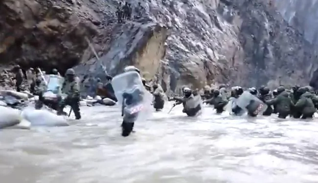 The Chinese state media video – clearly another attempt at propaganda – shows a large group of soldiers from both sides crossing a river in biting cold and meeting on the rocky banks, where some of them are seen pushing each other to go back. As night falls, soldiers from both sides are seen with flashlights, batons and shields standing on the edge of a cliff.