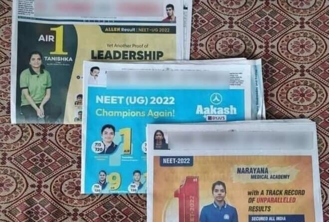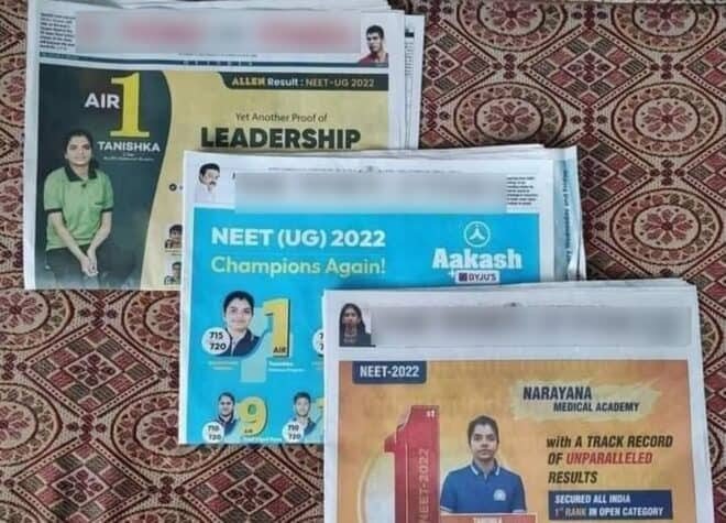 While placing full-page advertisements in leading English dailies, the three coaching institutes — Allen, Aakash and Narayana Medical Academy — have all put the picture of NEET topper Tanishka.