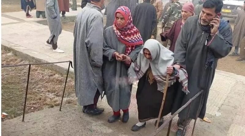 Bandipora, Dec 05 : Braving the cold weather, a 105-year-old woman cast her vote at a polling station in Hakbara area of Hajin-A constituency in north Kashmir’s Bandipora district on Monday.