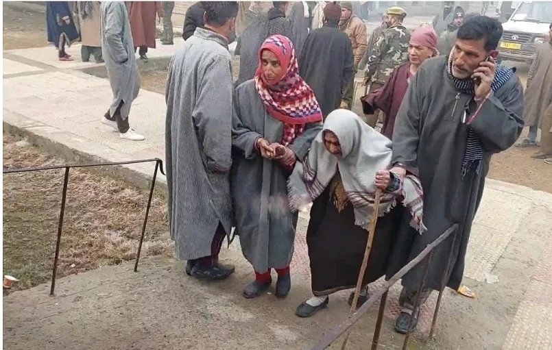 Bandipora, Dec 05 : Braving the cold weather, a 105-year-old woman cast her vote at a polling station in Hakbara area of Hajin-A constituency in north Kashmir’s Bandipora district on Monday.