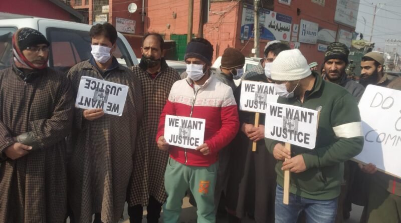 Over a dozen mutton traders assembled here in Press Enclave Srinagar carrying placards seeking justice.