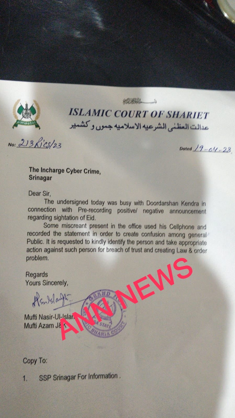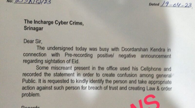 In its complaint addressed to Cyber Police Srinagar, the Mufti Nasir has written: “The undersigned today was busy with Doordarshan Kendra in connection with Pre-recording positive/ negative announcement regarding sightation of Eid.”