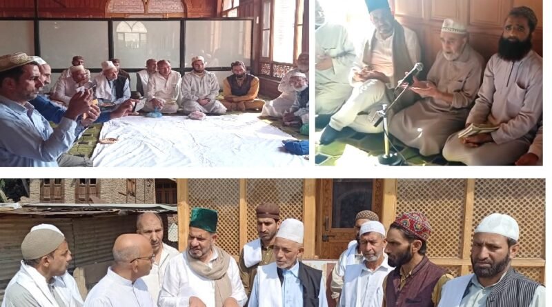 Srinagar 4th Sept:–Khwaja Farooq Renzushah Chairman Jamaat Aitqaad Hanafiya international who is also Chairman Hazrat Bulbul shah RA constitutional Trust today presided over the massive gathering of Hanafi devotees and delivered keynote address. Imam-e-Khateeb wa Nawat Khwan Jenab Moulana Javid sahib offered 313 Khatmaat wa Muzamaat on the occasion on 7th Safar which is being regarded as recognised 7th in every Islamic month devoted to the Great saint. Hazrat Abdul Rahman Sharaf udya din Bulbul shah RA was the first Sufi Hanafi saint who played a great role during 1321 Grand revolution of Kashmir for ensuring communal harmony & mutual brotherhood in Kashmir. The king of Kashmir Sultan Sader ud din Rinchanshah RA granted him State subject of Kashmir, built khankah for him where he remained till his death and chose only Kashmir as his everlasting spiritual abode.