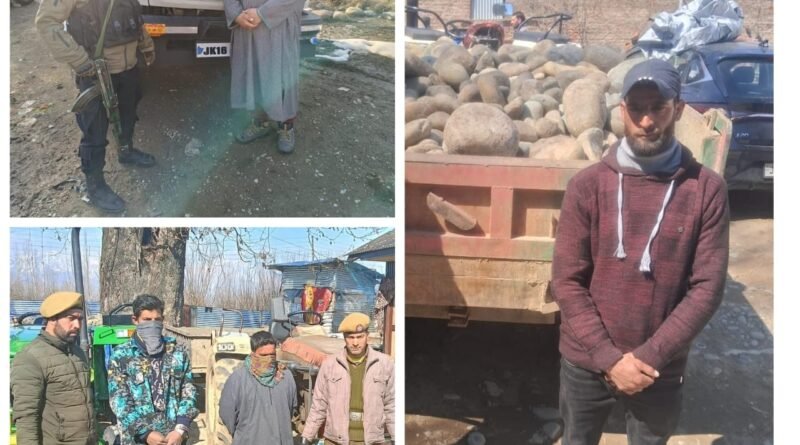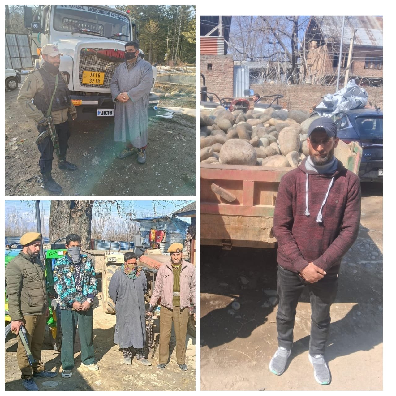 Police under the supervision of SDPO Tangmarg & SDPO Pattan assisted by SHO PS Tangmarg, IC PP Mirgund & Kungamdara seized 04 vehicles (01 tipper & 03 tractors), besides arresting four drivers. They have been identified as Fayaz Ahmad Malla son of Bashir Ahmad resident of Pati Yangoora, Gulzar Ahmad Teli son of Mohammad Akbar resident of Hanjiwera Payeen, Yasir Ali Dar son of Mohsin Dar resident of Kripalpora Payeen & Naseer Ahmad Ganie son of Noor Mohd Ganie resident of Babagund Pattan.