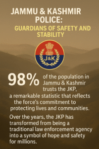 Recent surveys reveal that 98% of the population in Jammu & Kashmir trusts the JKP, a remarkable statistic that reflects the force’s commitment to protecting lives and communities. Over the years, the JKP has transformed from being a traditional law enforcement agency into a symbol of hope and safety for millions.