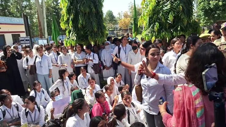 Jammu, Apr 20: In the wake of a student losing her life after falling off a moving bus last week, hundreds of female students from a government college for women staged a protest in Gandhi Nagar here on Monday, demanding justice.