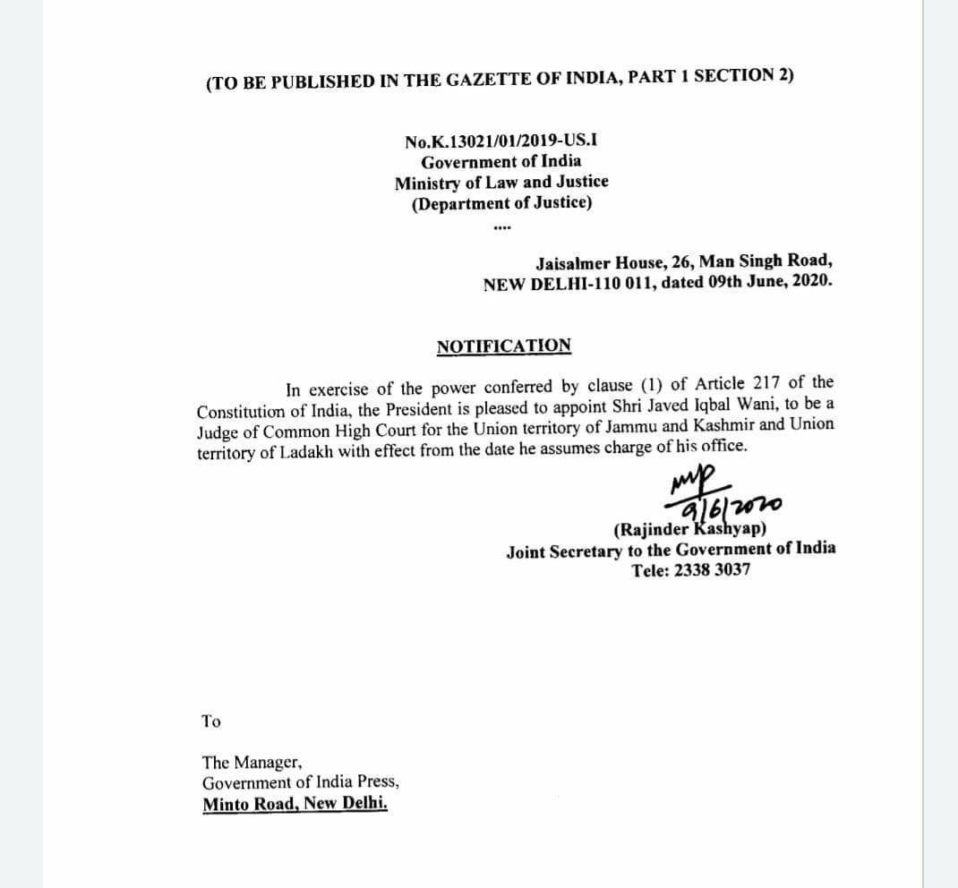 “In exercise of the power conferred by clause (1) of Article 217 of the Constitution of India, the President is pleased to appoint Shri Javed Iqbal Wani, to be a Judge of Common High Court for the Union territory of Jammu and Kashmir and Union territory of I.adakh with effect from the date he assumes charge of his office,” reads the notification issued by the GoI.