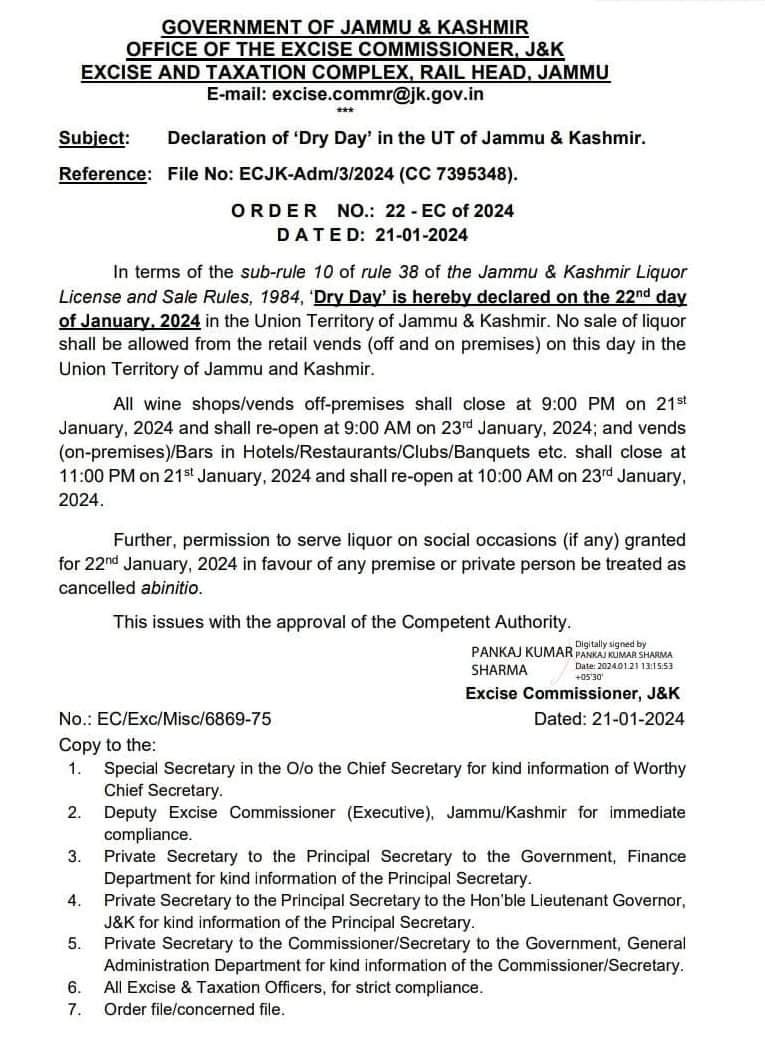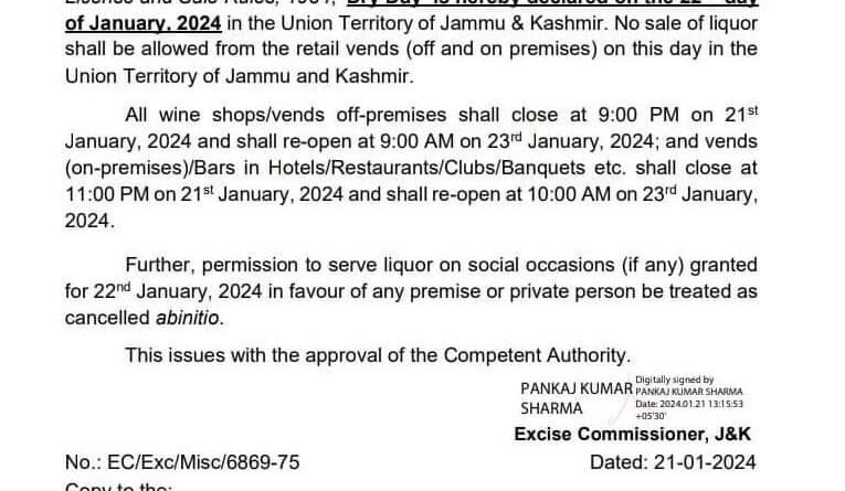 Srinagar, Jan 21: The Jammu and Kashmir government has announced half-day public holiday on Monday in view of the consecration ceremony of Ram Temple in Uttar Pradesh’s Ayodhya.