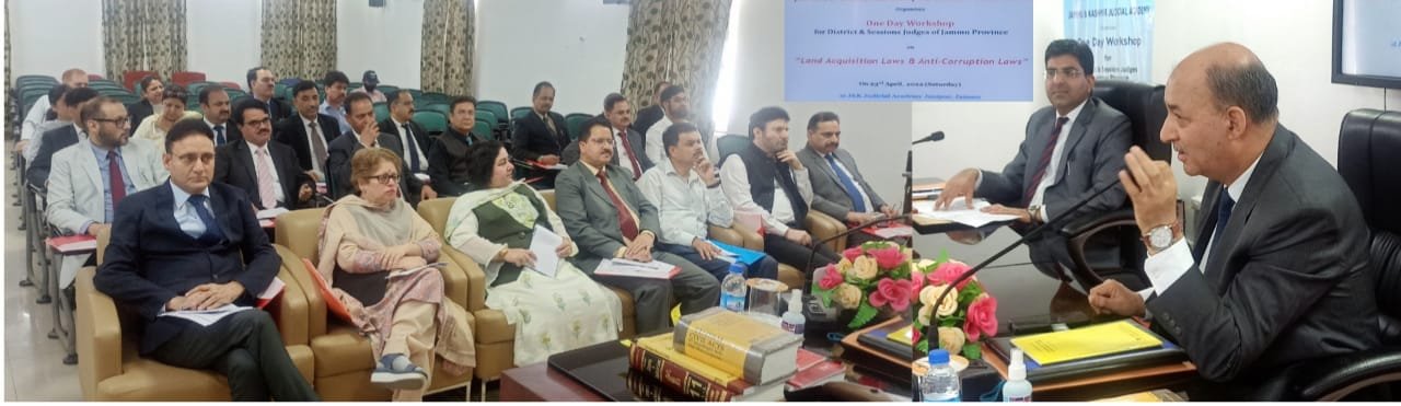 JAMMU, APRIL, 23: J&K Judicial Academy under the patronage of Justice Pankaj Mithal, Chief Justice, High Court of Jammu & Kashmir and Ladakh, (Patron-in-Chief, J&K Judicial Academy) and guidance of Justice Dhiraj Singh Thakur, Chairman, Governing Committee for J&K Judicial Academy and Justice Sindhu Sharma and Justice Javed Iqbal Wani; Members of Governing Committee for J&K Judicial Academy, organized one day workshop for District and Sessions Judges of Jammu Province including those on deputation on “Land Acquisition Laws and Anti-Corruption Laws” at Judicial Academy, here.