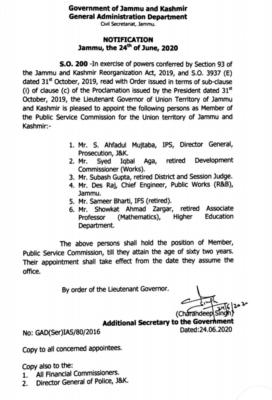 Srinagar: The Jammu and Kashmir Public Service Commission (PSC) was reconstituted on Wednesday after the nomination of six members to the commission that recommends all appointments to the gazetted posts in the Union Territory.