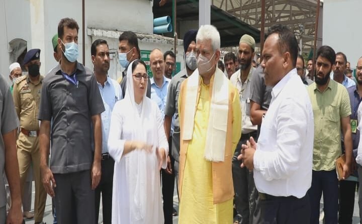 Srinagar, July 7: Lieutenant Governor of Jammu & Kashmir Manoj Sinha along with J&K Waqf Board Chairperson Dr Darakhshan Andrabi today paid a visit to Dargah Hazratbal Shrine to take stock of the Eid celebrations. Lieutenant Governor & Waqf Chairperson interacted with all government departmental representatives & Waqf management Committee representatives involved in the Eid arrangements and instructed them to upgrade the facilities for the devotees.