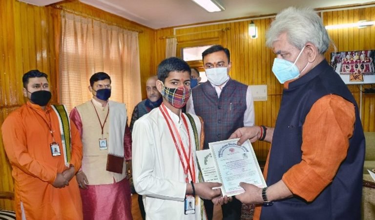 KATRA: Lieutenant Governor, Manoj Sinha, who is also the Chairman of Shri Mata Vaishno Devi Shrine Board, today felicitated the students of Shri Mata Vaishno Devi Gurukul for securing 1st positions in Sampurnanand Sanskrit University.