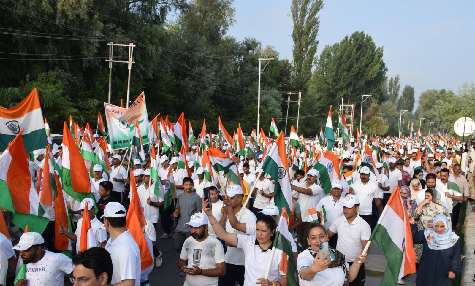 SRINAGAR, AUGUST 12: Lieutenant Governor Shri Manoj Sinha today flagged-off the Tiranga Yatra in Srinagar and joined the public representatives, officials and thousands of citizens in the walkathon from International Convention Centre to Botanical Garden.