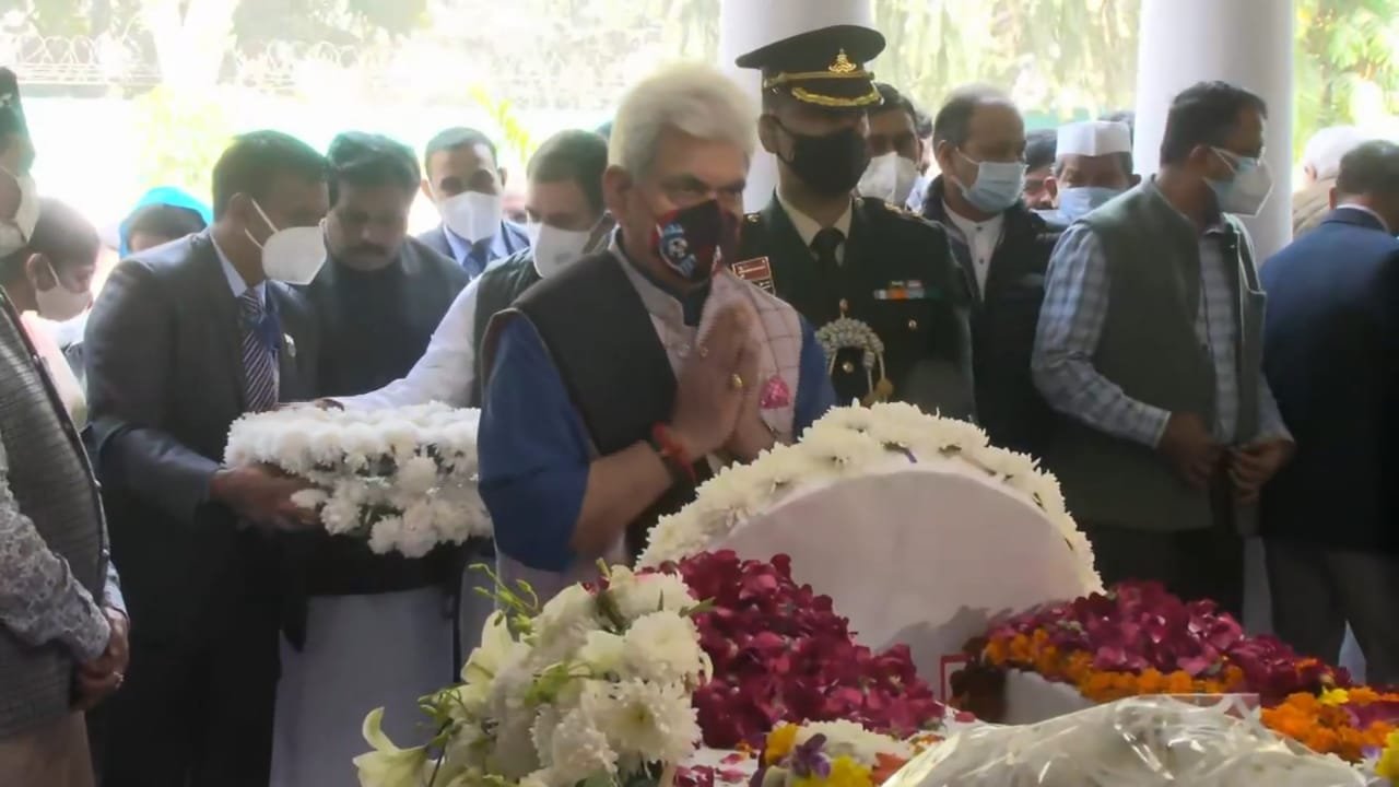 DELHI, DECEMBER 10: Lieutenant Governor Manoj Sinha today paid his last respects to the Chief of Defense Staff General Bipin Rawat and his wife, Smt Madhulika Rawat.