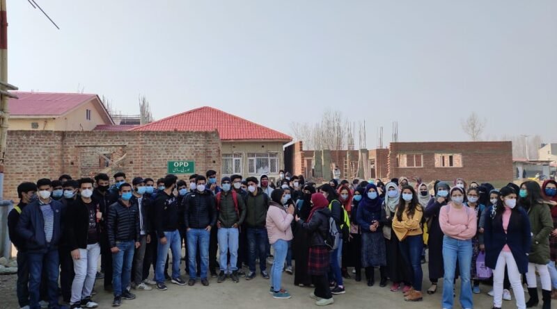 Srinagar: As many as 250 MBBS students on Friday morning staged a protest in the premises of SKIMS Medical College Srinagar against the administration for not taking concrete steps to commence the clinical classes and forcing students to face hardships.