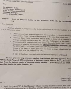 In a letter to the People”s Democratic Party (PDP) president, the passport officer has informed Mehbooba that her application for an Indian passport has been rejected as the Criminal Investigation Department (CID) of the Union Territory had recommended against granting the document to her.