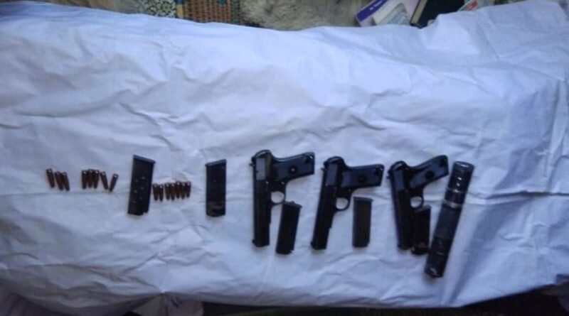 “During the search operation, three Chinese pistols two magazines, 15 rounds of Chinese pistol and a silencer were recovered from the house of Ghulam Ahmed Natnoo of Bikheryan while as the militant identified as Firdous Ahmed S/O Ghulam Ahmed R/O Bikheryan was apprehended from his house,” the police spokesman said.