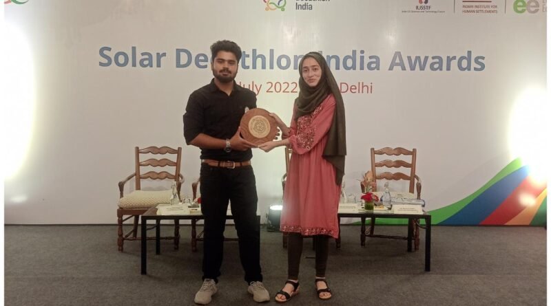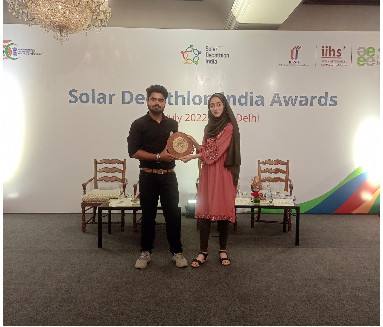 Srinagar, July 03, 2022: Two students from National Institute of Technology Srinagar (NIT) Srinagar along with their team ‘TEJASVI’ bagged Solar Decathlon India awards’ at Solar Decathlon India Design Challenge 2021-22 held in New Delhi.