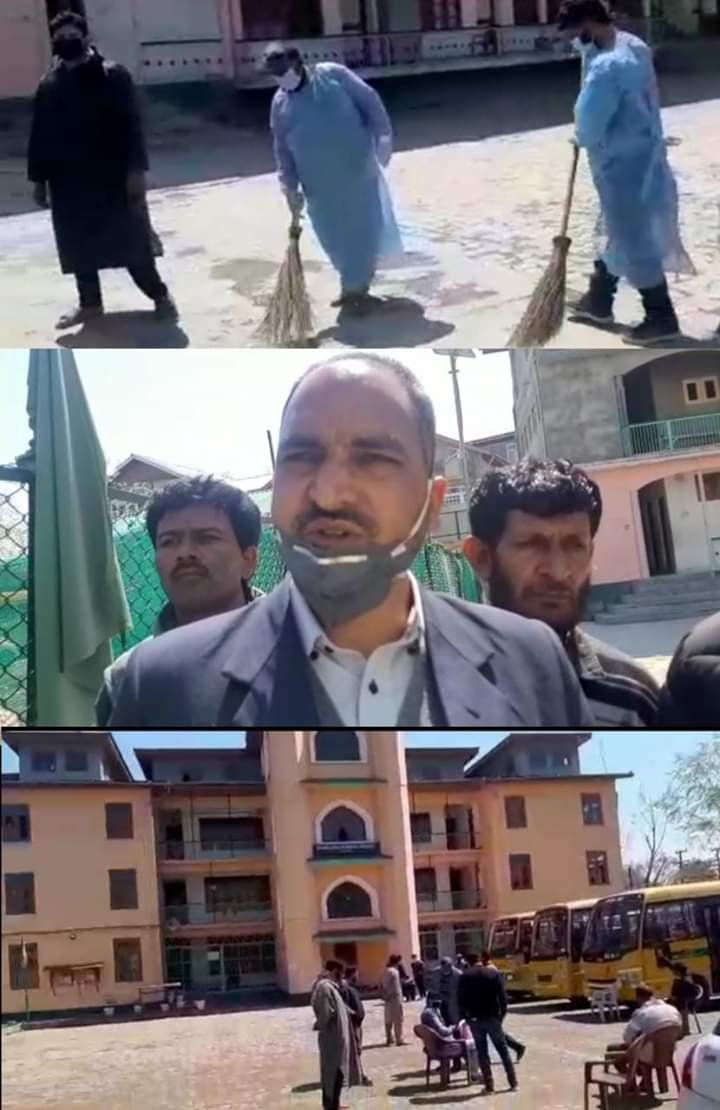 Srinagar : Employees of Urban Local Bodies, Muncipality Committee Pampore District Pulwama in Kashmir continued in frontline in a view of Pandemic Covid-19 coronavirus against deadly disease while as Sweepers during a cleaning and fumigation, spray and sanitising drive done entire areas of Tehsil Pampor like Drangbal, Astaan Mohalla, Namblabal, Kadlabaland, Dar Mohalla and other Government offices inncluding a JK Bank Office Pampore