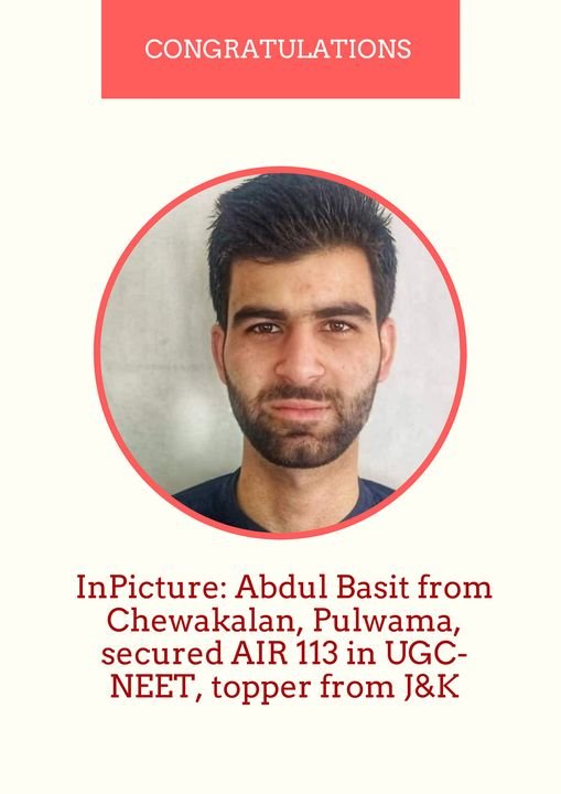 Srinagar, Jun 13 : In UG National Eligibility cum Entrance Test (NEET) 2023 results, Abdul Basit has bagged first position from Jammu and Kashmir.