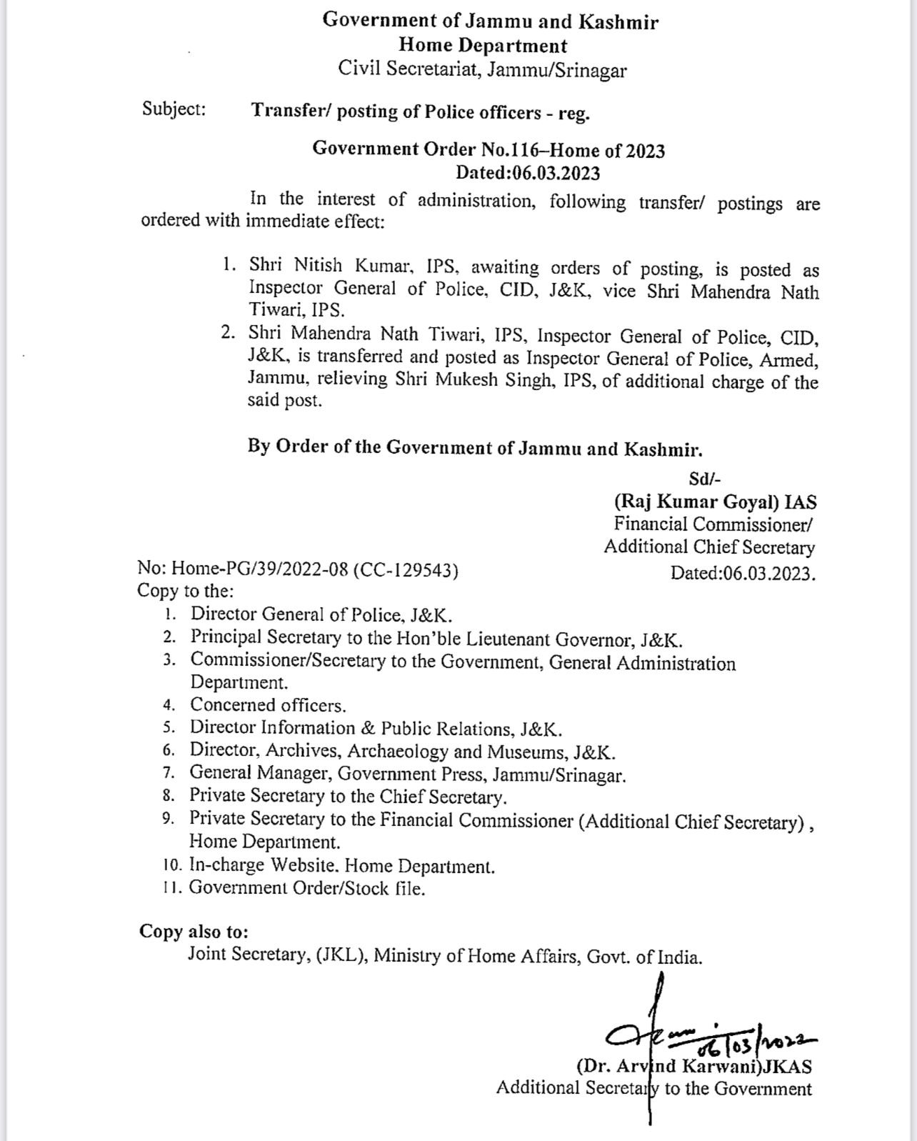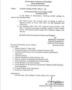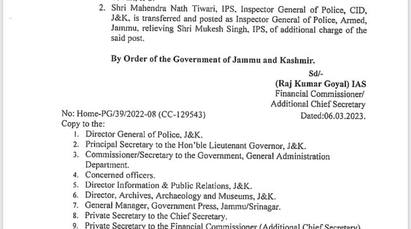 Tiwari, Inspector General of Police, CID, J&K has been transferred and posted as Inspector General of Police, armed, Jammu, relieving Mukesh Singh, IPS, of additional charge of the post