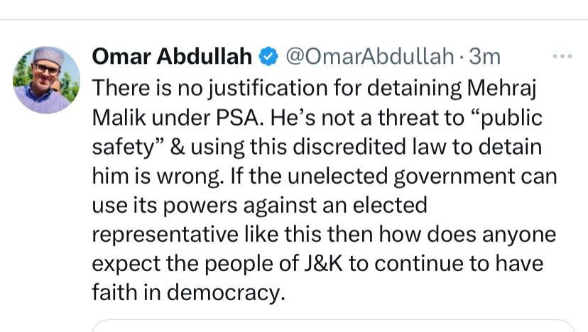 In a post on X (formerly Twitter), Abdullah said, “There is no justification for detaining Mehraj Malik under PSA. He’s not a threat to ‘public safety’ and using this discredited law to detain him is wrong. If the unelected government can use its powers against an elected representative like this, then how does anyone expect the people of J&K to continue to have faith in democracy?”