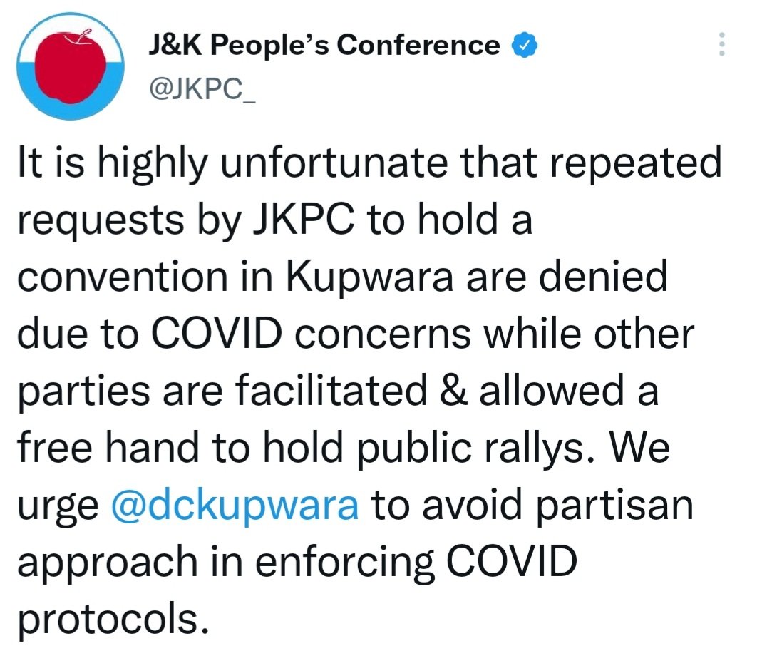 “It is highly unfortunate that repeated requests by JKPC to hold a convention in Kupwara are denied due to COVID concerns while other parties are facilitated & allowed a free hand to hold public rallies. We urge @dckupwara to avoid partisan approach in enforcing COVID protocols”, J&K Peoples Conference tweeted from their official account.
