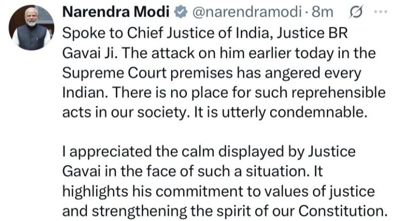 Taking to social media, the Prime Minister said he had spoken to Chief Justice Gavai following the incident. “The attack on him earlier today in the Supreme Court premises has angered every Indian. There is no place for such reprehensible acts in our society. It is utterly condemnable,” PM Modi stated.