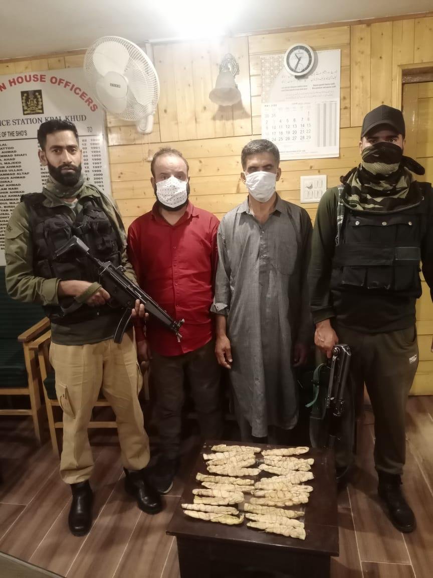 Acting on specific information regarding the movement of notorious drug peddlers boarding a vehicle (Load Carrier) bearing registration number JK13C-3415 around SP College & Barbarshah areas, a special checkpoint was established by PS Kralkhud at Barbarshah and two notorious drug peddlers were arrested. During search, officers were able to recover 1kg of Charas like substance from their possession. They have been identified as Ghulam Hassan Bhat son of Ab Rahim Bhat resident of Mirgund Kanelwan Bijbehara and Sartaj Ahmad Ganie son of Ghulam Mohammad Ganie resident of Kanelwan Bijbehara. They have been shifted to police station where they remain in custody. Vehicle used in the commission of crime has also been seized.