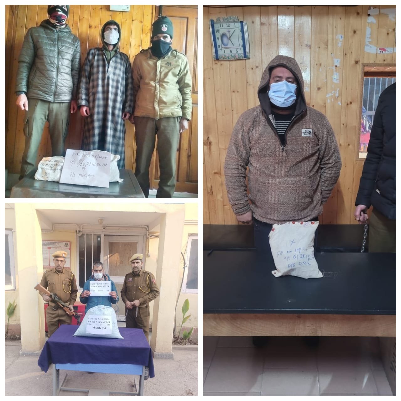 January 24: Continuing its efforts to eradicate the menace of drugs from the society, Police have arrested 03 drug peddlers in Budgam, Baramulla & Ganderbal and recovered psychotropic/contraband substances from their possession.