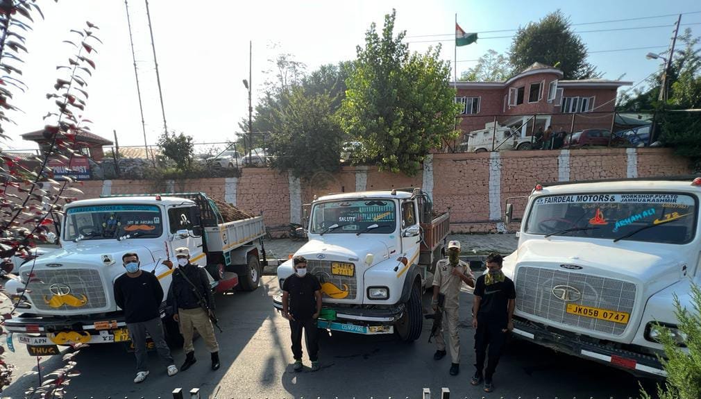 A police party of PP Humhama at a checkpoint established at Laloo Sheshgari intercepted three tippers loaded with illegally extracted soil. The vehicles bearing registration numbers JK01M-2211, JK05B-0747 and JK04B-7700 have been seized and their drivers identified as Basharat Ali Ganai son of Mohammad Baqir Ganai resident of Bodina Budgam, Javaid Ahmad Ganai son of Ghulam Mohammad Ganai resident of Bodina Budgam and Sarfaraz Akhter Chopan son of Zahoor Ahmad Chopan resident of Mahawar Budgam were arrested. They have been shifted to police station where they remain in custody.