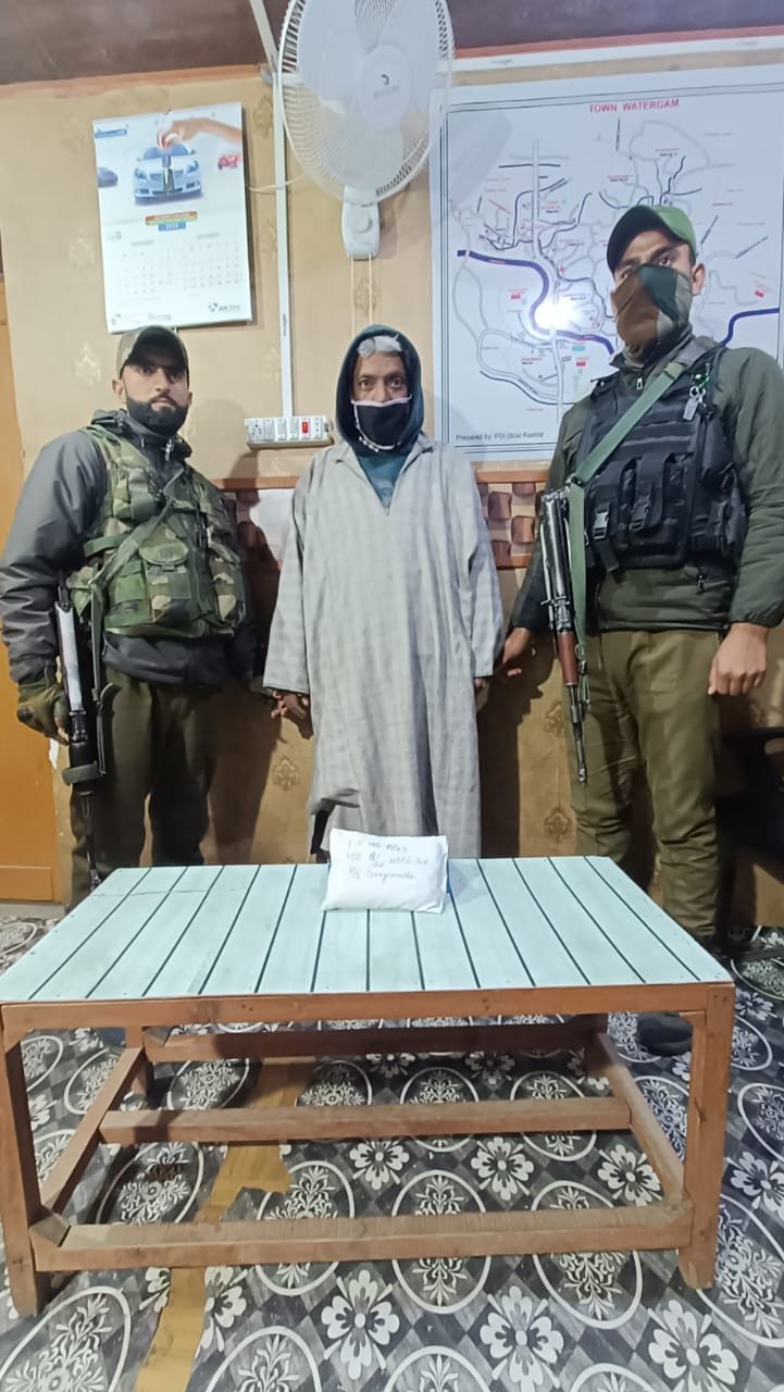 A police party led by Incharge Police Post Watergam at a checkpoint established at Hib Dangerpora Rafiabad intercepted a suspicious person. During search, 210 grams of charas like substance was recovered from his possession. He has been identified as Muneeb Ahmad Dar son of Abdul Jabar Dar resident of Muqam Shaheed Mir Bomai. He has been arrested and shifted to police station where he remains in custody.