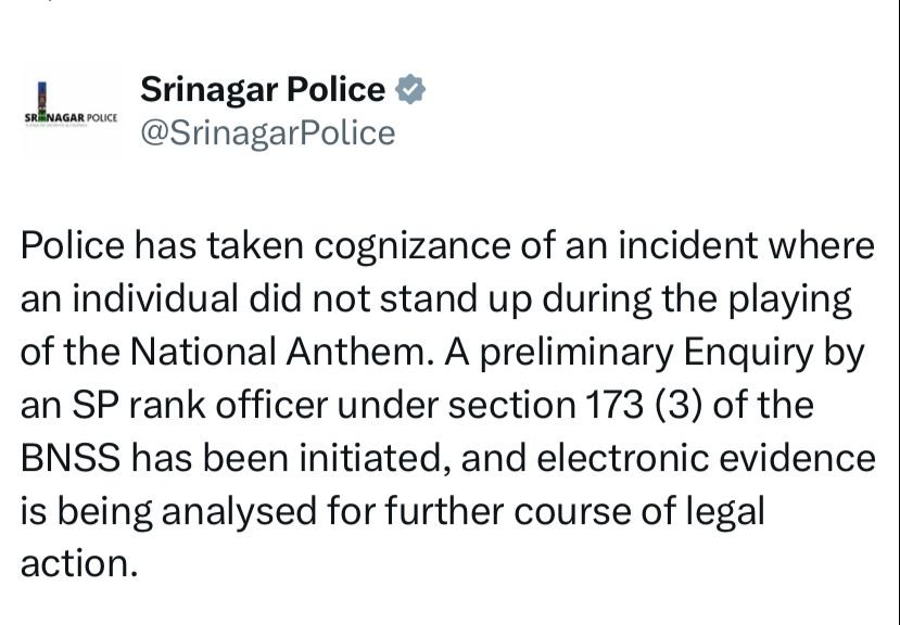 Srinagar, October 17 – The police have taken cognizance of an incident where an individual failed to stand up during the playing of the National Anthem at a public event. The case, which has sparked widespread debate, is being handled with urgency as it involves matters of national respect and dignity.