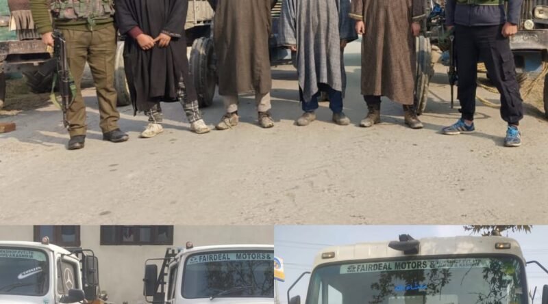 A police party under the supervision of DySP Hqrs Baramulla assisted by SHO PS Baramulla and Incharge PP Delina seized 7 vehicles (3 tippers and 4 tractors) and arrested 7 persons (Drivers) at Delina and Main Market Baramulla for their involvement in illegal extraction and transportation of minerals. The accused drivers have been identified as Ashiq Ahmad Dar son of Ab Rehman resident of Jalsheeri, Bashir Ahmad Khan son of Lal Din resident of Kanispora, Manzoor Ahmad Gojree son of Mohd Shaban resident of Drangbal, Shahid Hamid Rather son of Abdul Hamid, Farooq Ahmad Mir son of Wali Mohd, Mohd Arif Dar son of Fayaz Ahmad & Javaid Ahmad Dar son of Ghulam Nabi, all residents of Darpora Delina. They have been shifted to police station where they remain in custody.