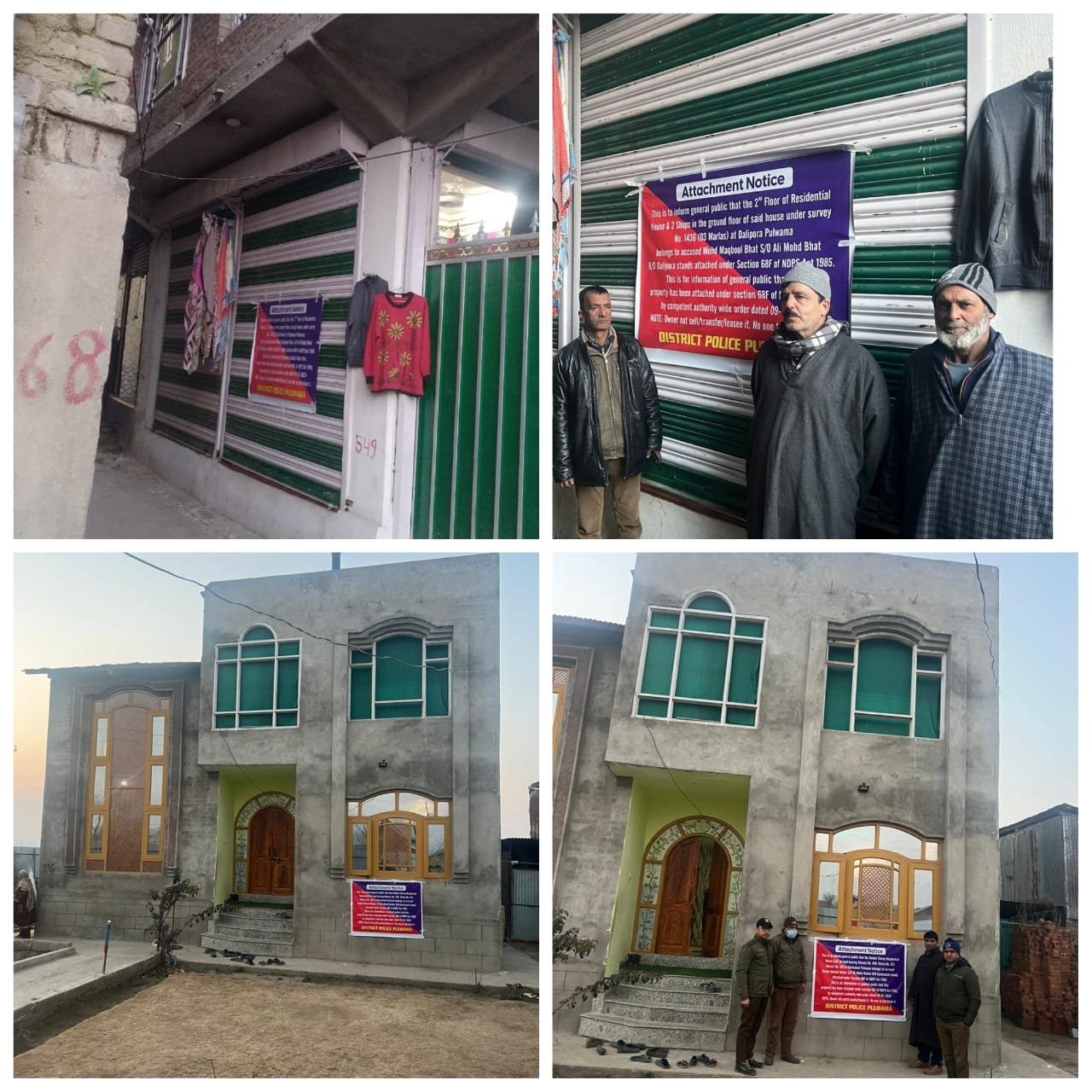 January 09: In a relentless effort to curb the menace of drug peddling, Police in Pulwama today, attached a double-storied residential house valuing approximately Rs 20,97,291/- belonging to a notorious drug peddler namely Fayaz Ahmad Rather son of Gh Mohd Rather resident of Karimabad and Two Shops with 2nd floor as residential apartment valuing approximately Rs 27,35,186/- which belongs to a drug peddler namely Mohd Maqbool Bhat @Tola son of Ali Mohd Bhat resident of Dalipora Pulwama under section 8/21-29 NDPS Act 1985.