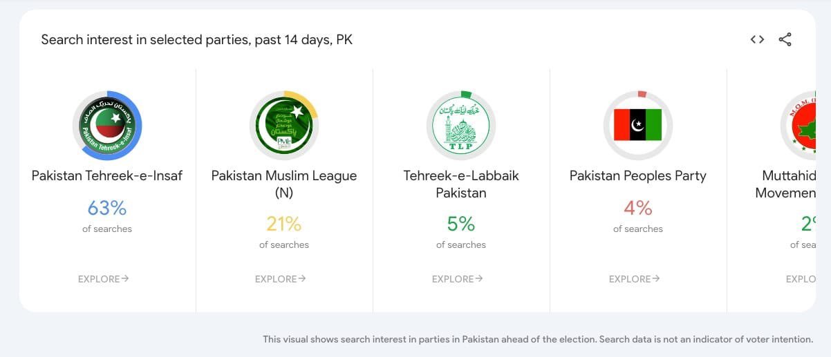For the media and the public to have easy access to this data, Google has introduced a page called ‘Google Trends Pakistan General Elections’ which contains queries regarding the parties participating in the elections, topics and offers information.
