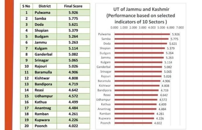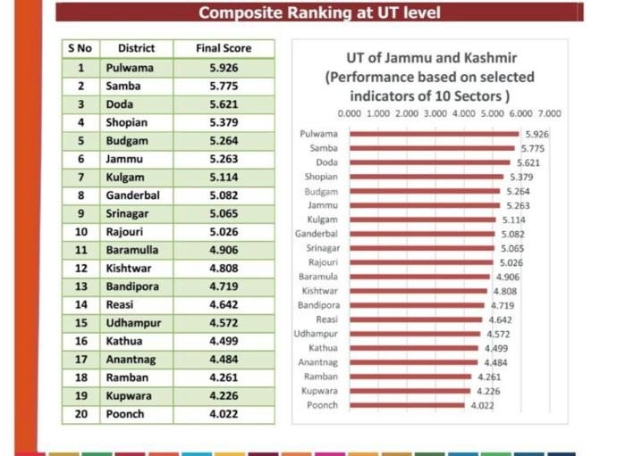 Details available with news agency Kashmir News Observer reveal that composite score of 20 districts was computed at UT level by aggregating the scores of 10 sectors i.e agriculture & allied sectors, industries & allied sectors, human resource development, public health, public infrastructure & utilities, financial inclusion, social welfare & development, judicial & public safety environment and citizen centric governance.