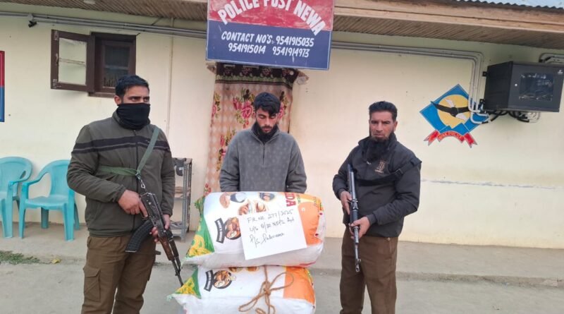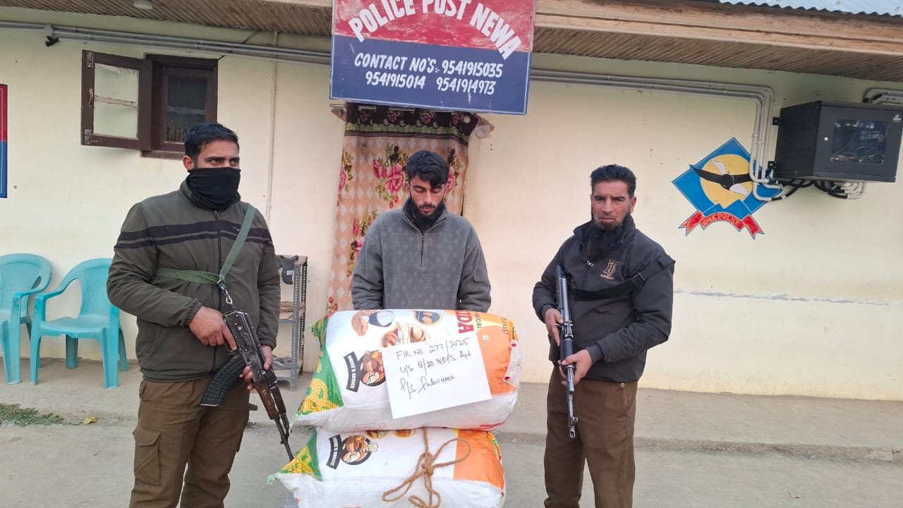 During naka checking at Newa Pulwama, a police team from Police Post Newa intercepted an individual identified as Rafiq Ahmad Shah, son of Bashir Ahmad Shah, resident of Newa Pulwama. During his personal search, 16.5 kilograms of charas powder-like substance was recovered and seized on the spot as per legal procedures. The accused was subsequently arrested.