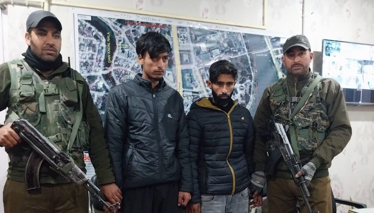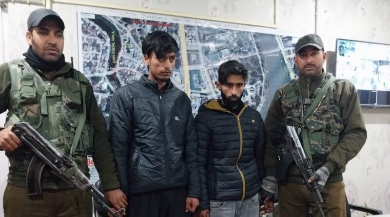 “Two persons identified as Asif Mehdi, son of Ghulam Mohiuddin Malik and Faisal Haroon, son of Irfan Haroon — both residents of Rakh Arth Bemina Srinagar, roaming suspiciously in Multi Level Car Parking in Sheik Bagh Lal Chowk were intercepted by a team of Police Station Maisuma. They tried to flee from the spot but were apprehended tactfully,” police said in a statement.