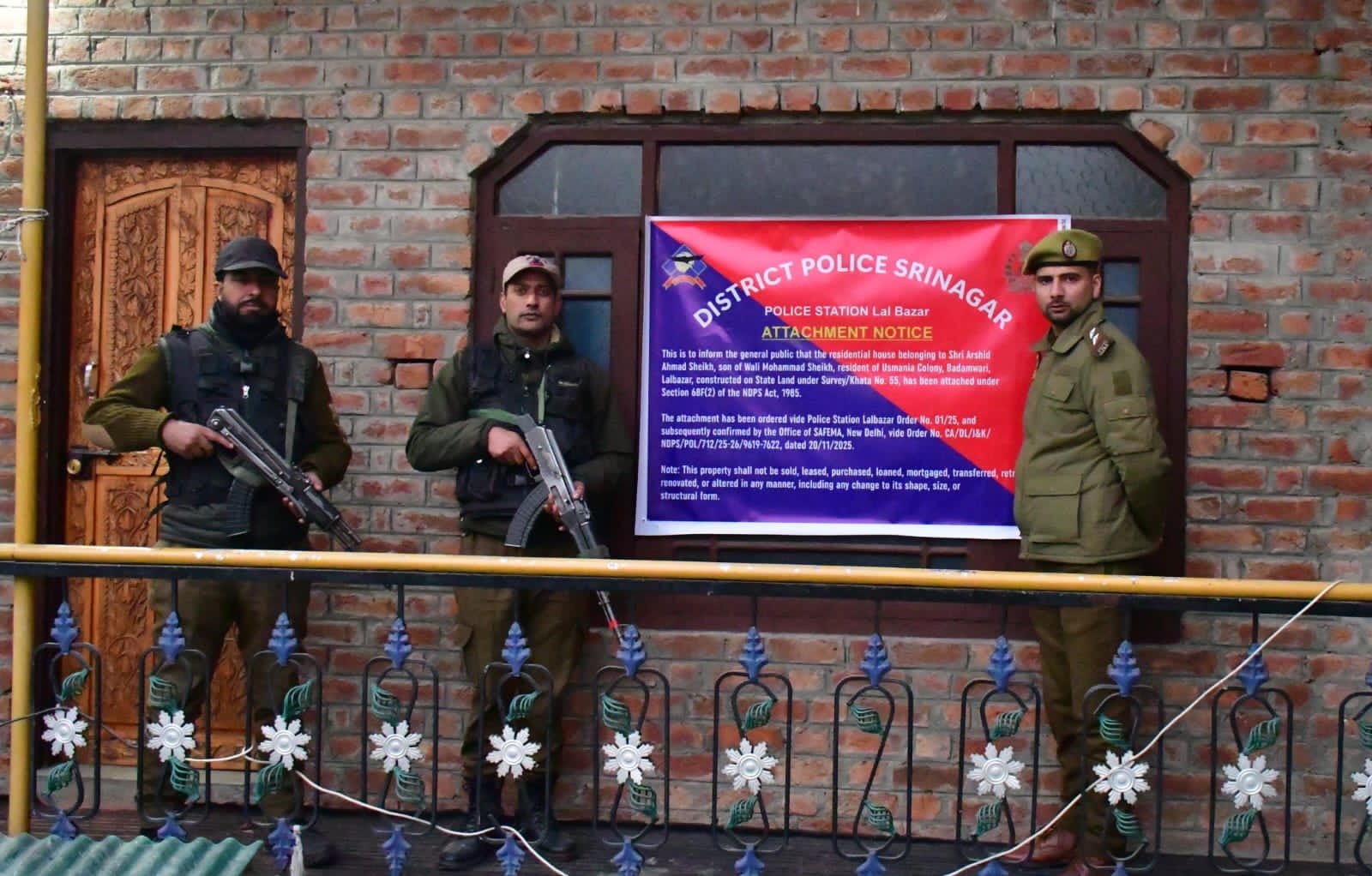 In a major action against the illegal narcotics trade, Srinagar Police today attached a double-storey residential house along with 4 marlas of land, valued at approximately ₹75 lakhs, under the provisions of the Narcotic Drugs and Psychotropic Substances (NDPS) Act.