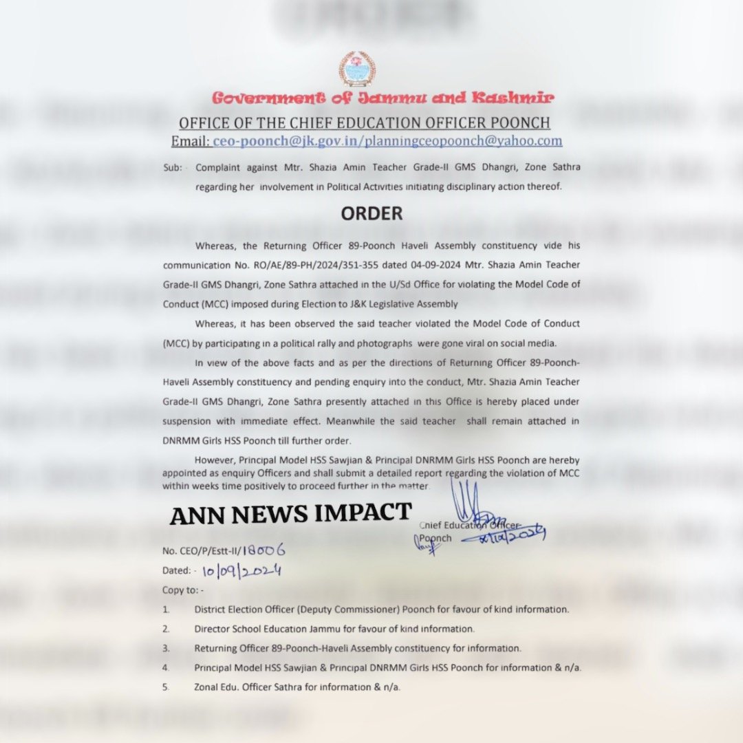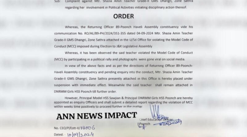 Teacher, . Shazia Amin, Grade-II at Government Middle School Dhangri, Zone Sathra, has been suspended for her involvement in political activities, which violated the Model Code of Conduct (MCC) during the ongoing elections to the J&K Legislative Assembly.